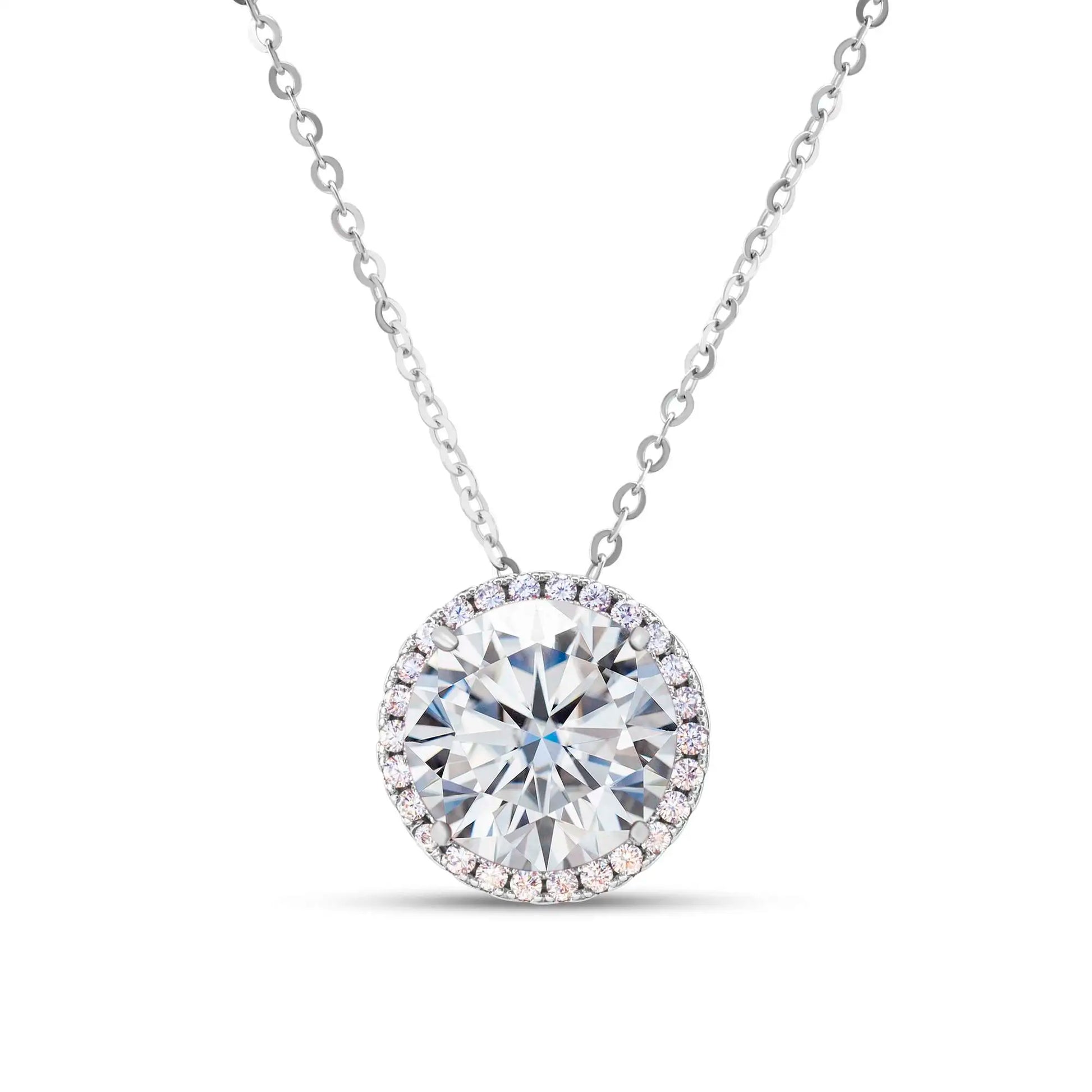 The "Celeste" Necklace is an artistic masterpiece embodying absolute purity and sublime beauty, like a star descended from the sky. The design is dominated by an enormous central Round Cut Moissanite stone, weighing a commanding 5 Carats, known for its flawless white color. The stone is surrounded by a micro-pave round halo frame, amplifying its sparkle and giving it a radiant, glowing effect.