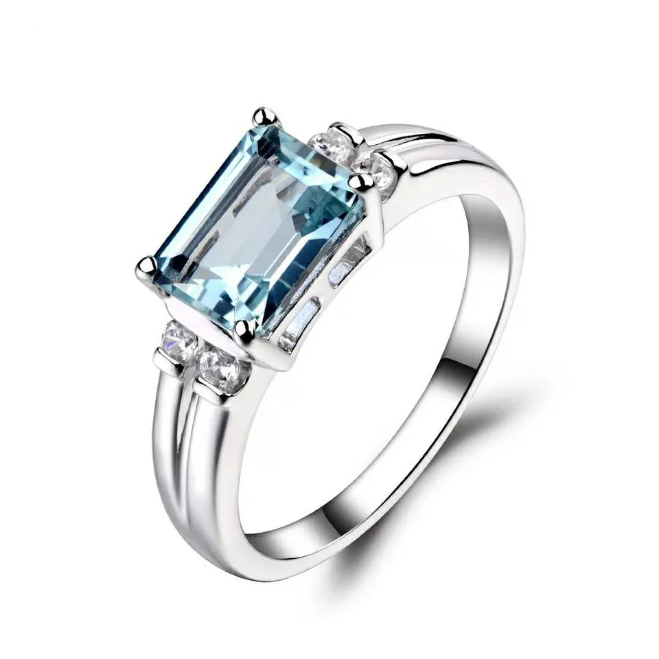 The "Eleganza" ring is the embodiment of timeless luxury, inspired by the quiet sophistication of classic Italian designs. The ring features a stunning Sky Blue Topaz stone (approx. 6x8) in an exquisite Emerald Cut, bordered by subtle diamond-like details on the sides.