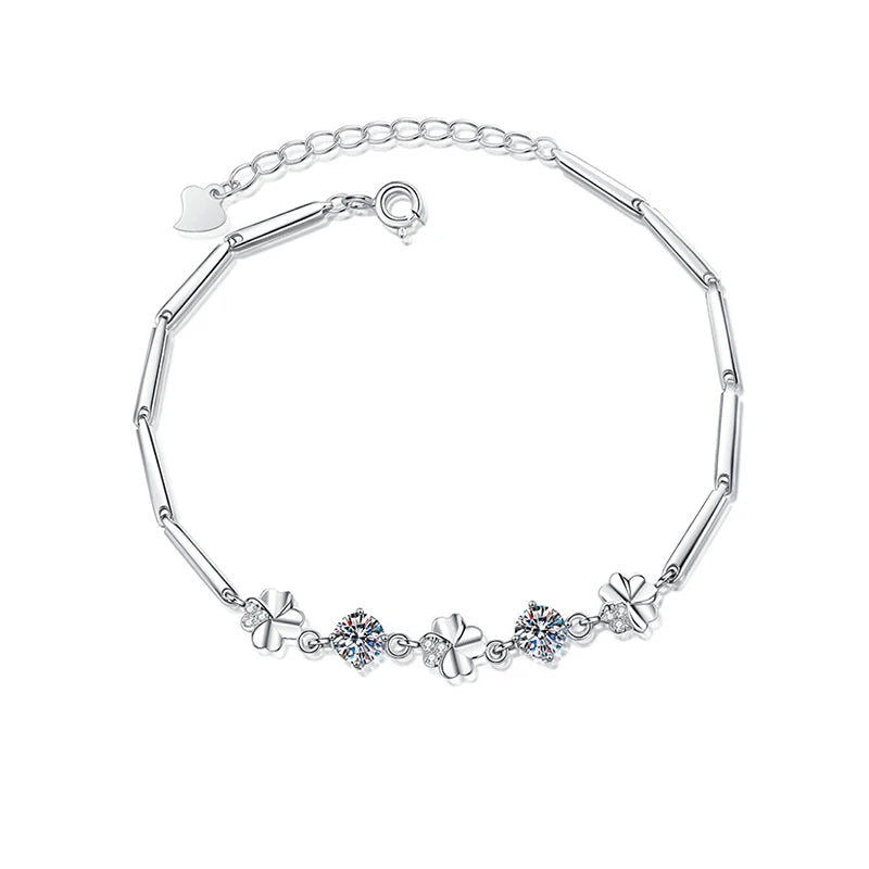 The "Fortuna" bracelet is a delightful piece that combines charming symbolism with subtle luxury. It features a succession of polished four-leaf clover units, intertwined with small, brilliant round Moissanite stones. This charming, link-style design ensures flexibility and light movement, making it a perfect everyday accessory and a thoughtful gift, symbolizing luck and prosperity.