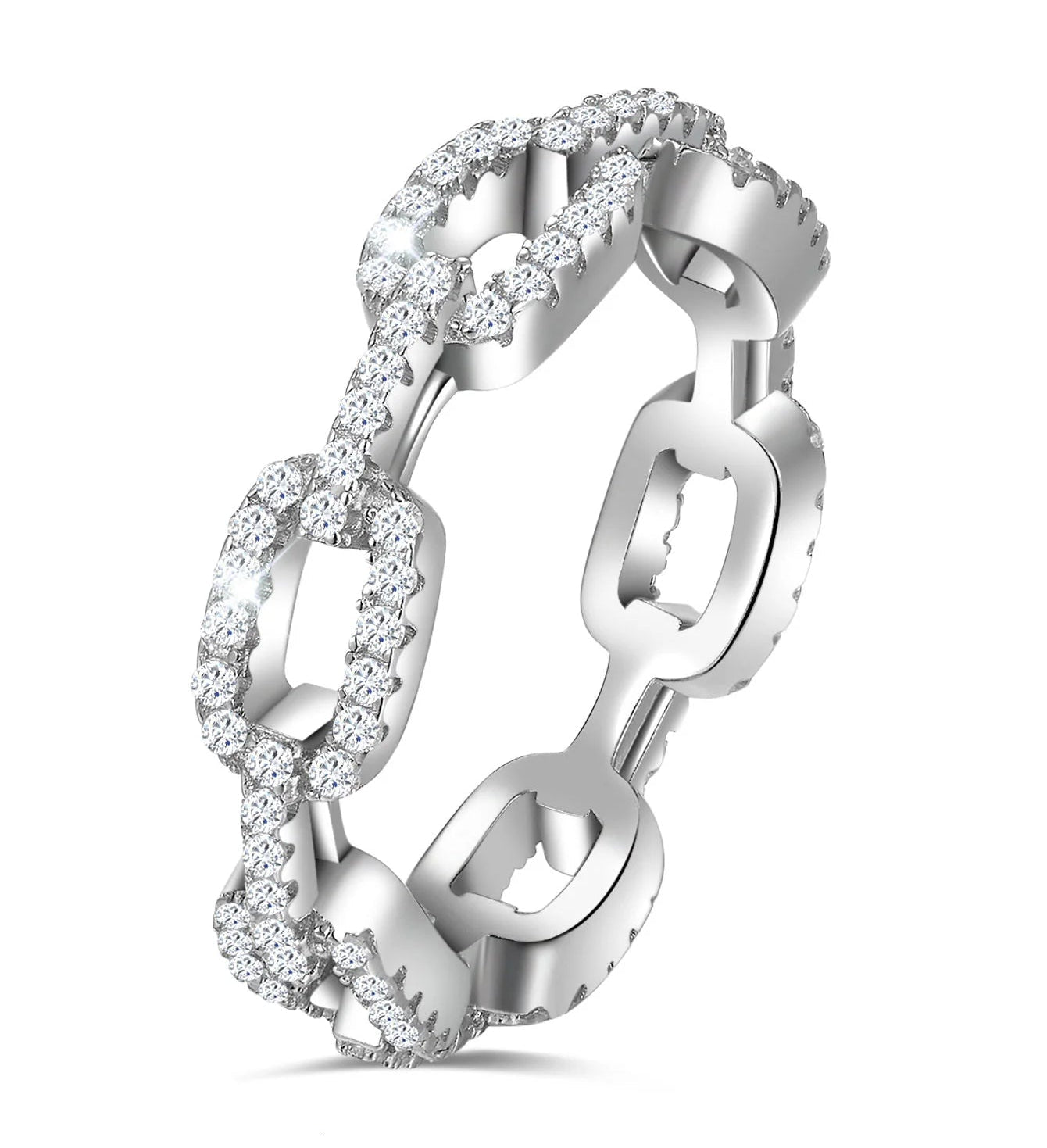 We present the "INTRECCIO" piece, designed to celebrate the strength and boldness of modern design. This ring features a Linked Chain Design where the paved links intricately interlock to create a striking, three-dimensional geometric pattern. Each link is set with sparkling Moissanite stones, ensuring endless brilliance with every movement. This elegant intertwining represents modern connections and sophisticated taste. The piece is designed for women and weighs approximately 3.2g, giving it a noticeable and luxurious presence.