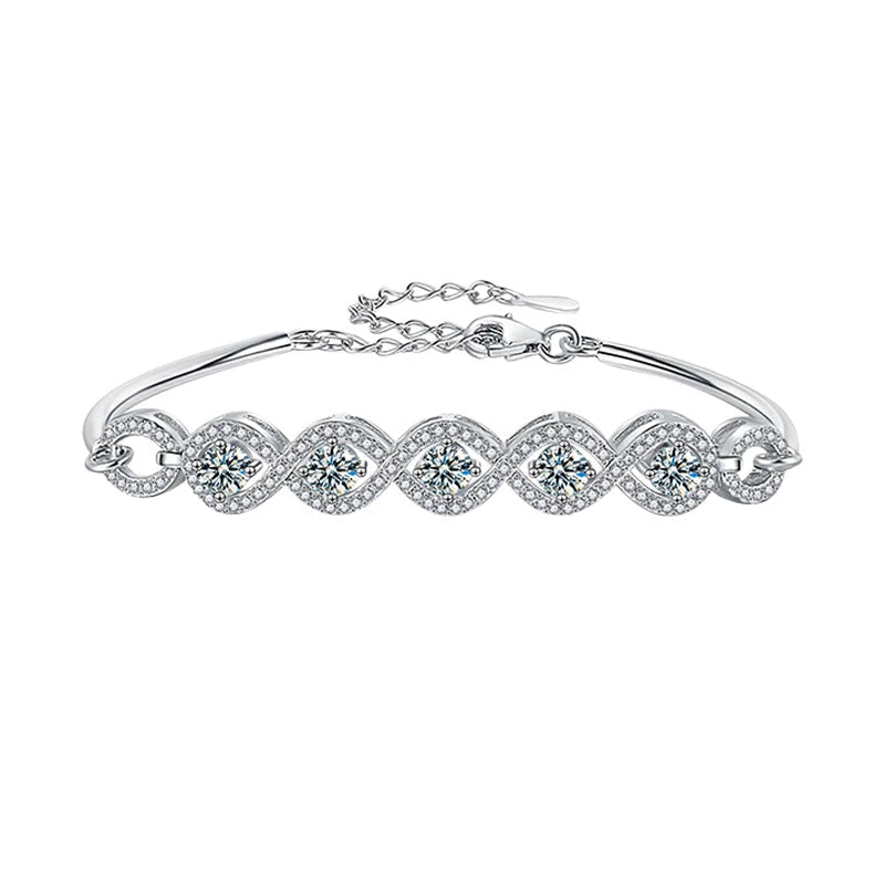 Design: Link-style bracelet with repeated Interlocking Oval Arches, featuring a pave halo and an adjustable chain.
