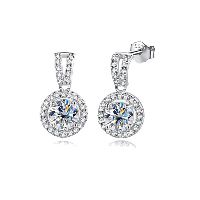 Design: Drop Earrings with a pave-set hook. The central Round Cut stone is surrounded by a halo of small Moissanite stones (Pave Halo setting).