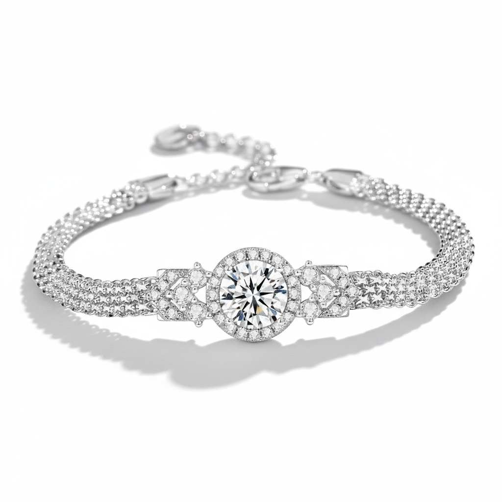The "Cerchio" bracelet is an exquisite piece that defines refined luxury. Designed to illuminate the wrist, it features a continuous band entirely paved with brilliant Zircon accents, creating an uninterrupted flow of light. The centerpiece showcases a stunning Round Cut stone, dramatically framed by symmetrical, geometrically paved shields. This bold yet timeless design ensures maximum sparkle with every movement.