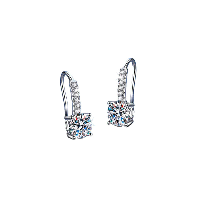 The Aurelia Drop Earrings embody the perfect balance of classic design and modern sparkle. They feature a fluid drop of light, with a brilliant Round Cut Moissanite stone 6.5 mm (1 ct per stone x 2 pcs) suspended from an elegant, pave-set hook. This is an essential piece of fine daily jewelry, providing diamond-like fire with every subtle movement. Meticulously crafted in 925 Sterling Silver, the Aurelia earrings weigh a comfortable 1.2g per pair.