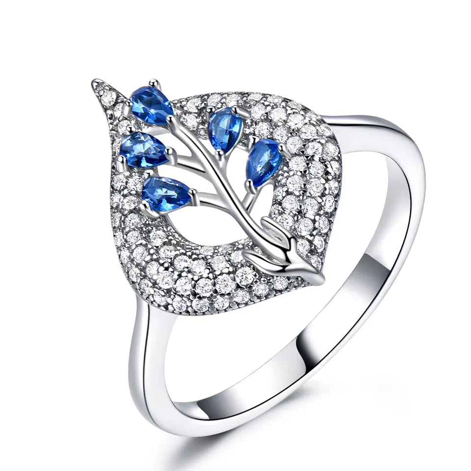 Design: Nature-inspired branch or leaf design, fully paved with blue pear-cut accents.