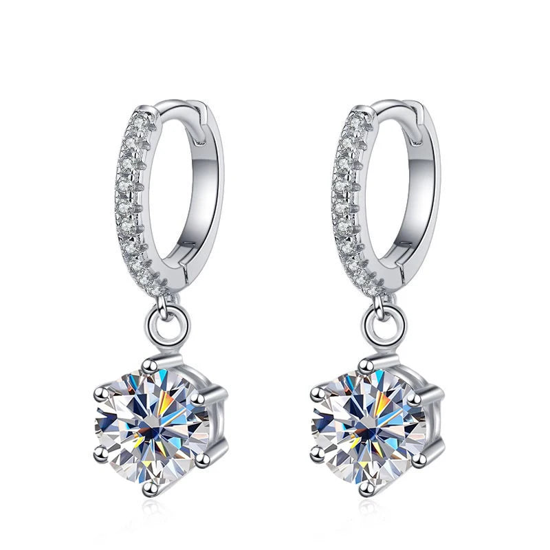 The Allegra Drop Earrings embody classic allure in a modern, compact design that balances elegance and comfort. These earrings feature a fully pave-set "Huggie Hoop" design, from which a brilliant Round Cut Moissanite main stone, measuring 6.5 mm, gracefully suspends. It is secured in a timeless 6-Prong Setting that maximizes light reflection and ensures ultimate sparkle. This "Fine" jewelry piece is designed to add an instant touch of everyday luxury. Meticulously crafted from 925 Sterling Silver, the Allegra earrings weigh a comfortable 2 grams per pair.